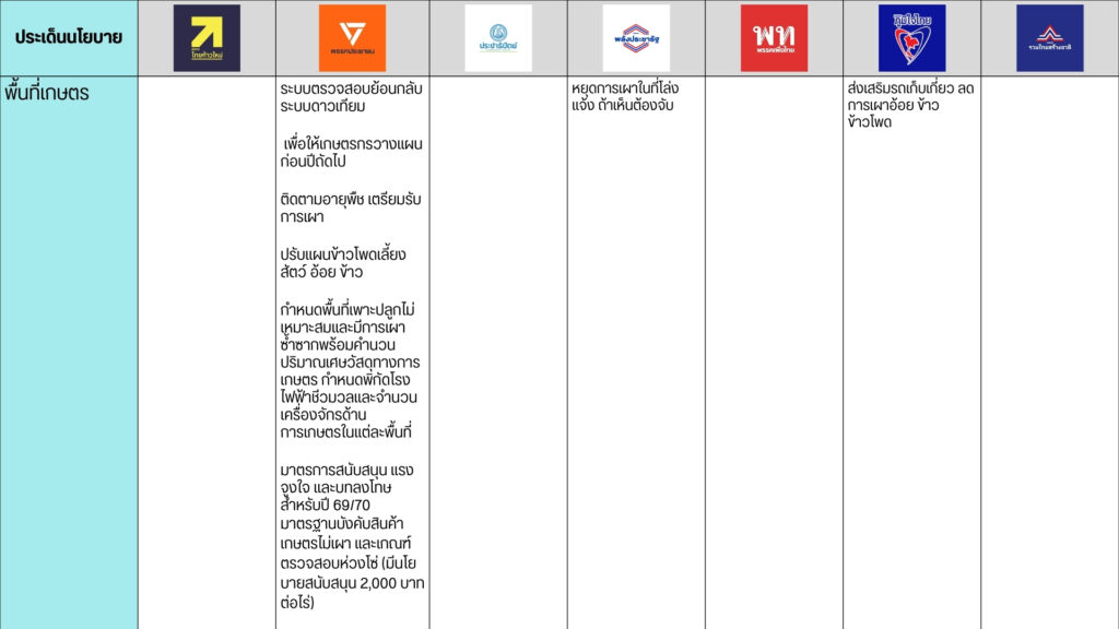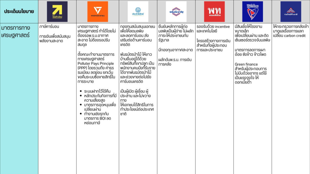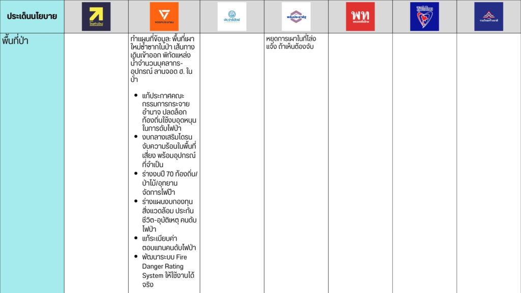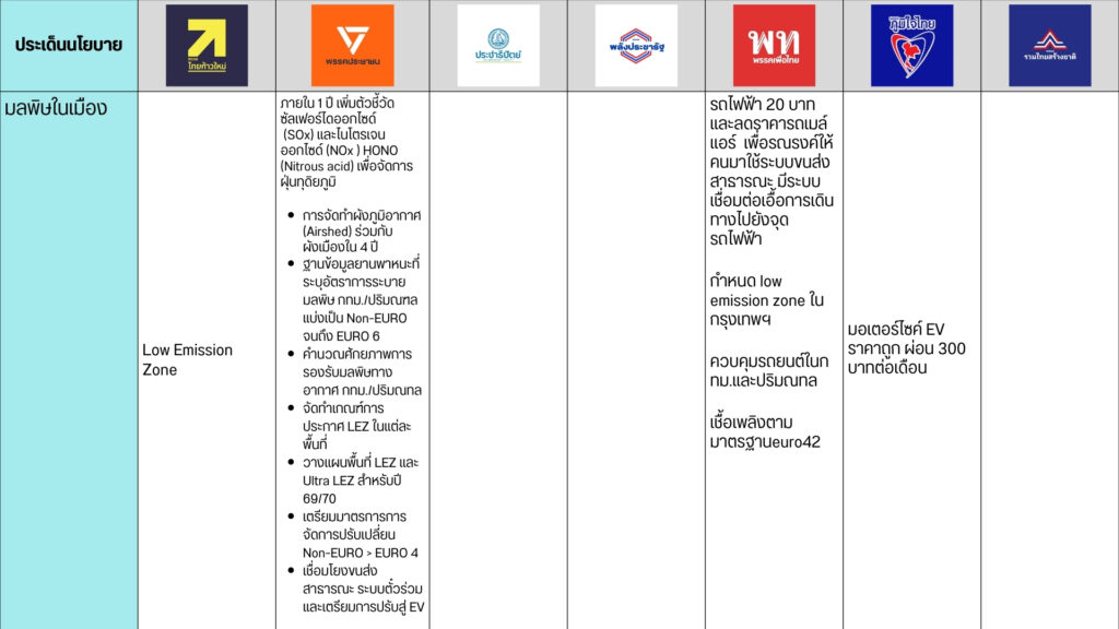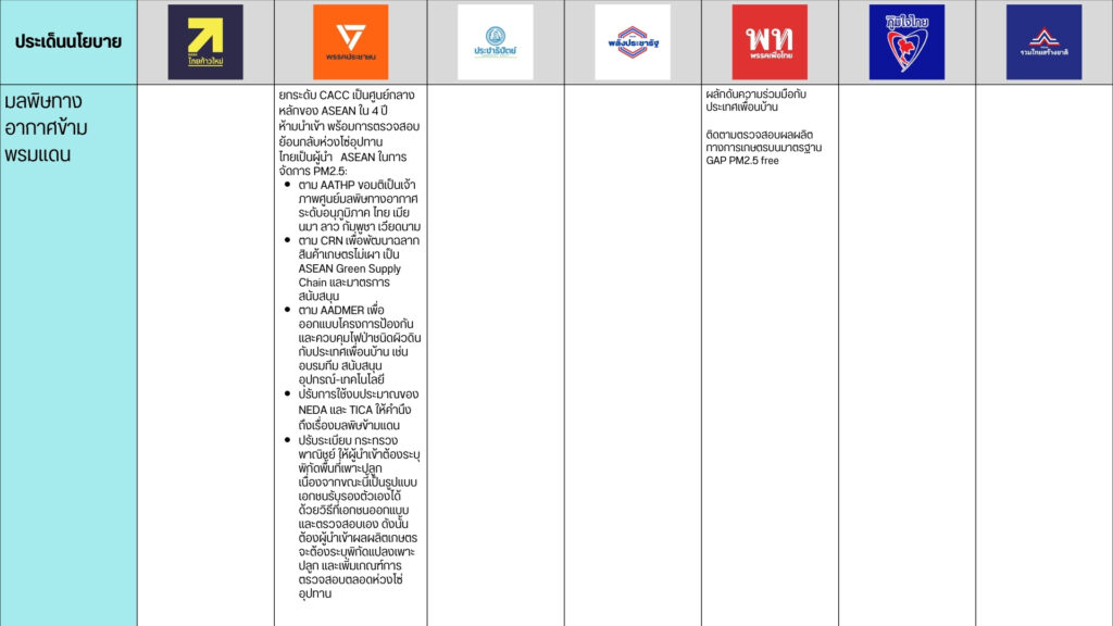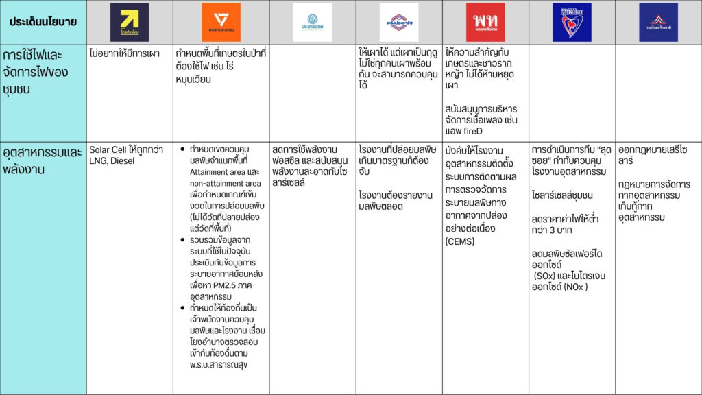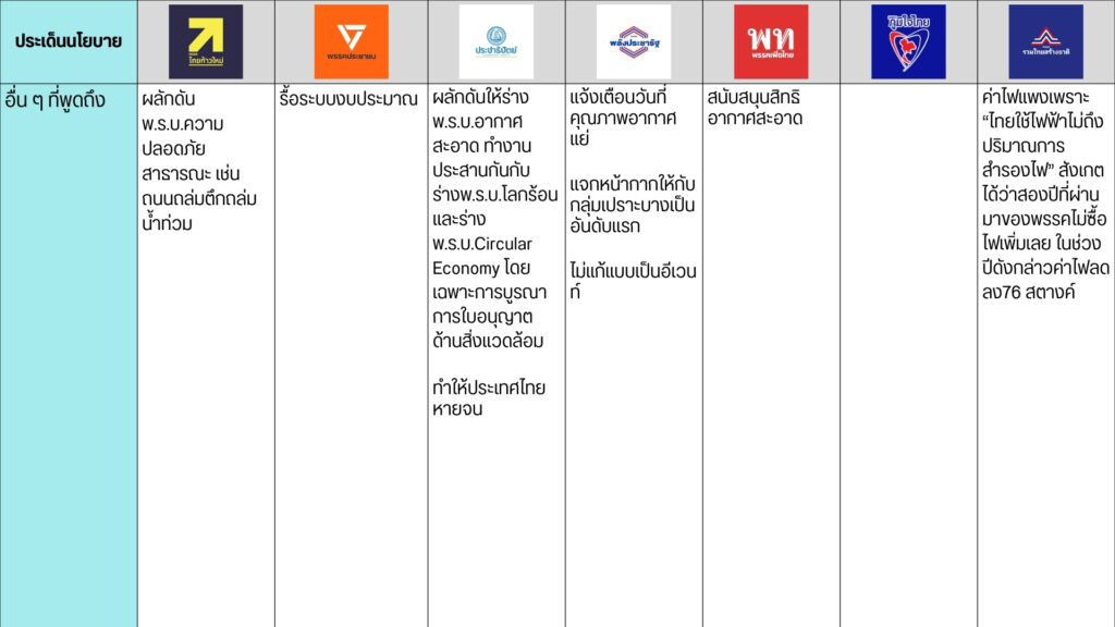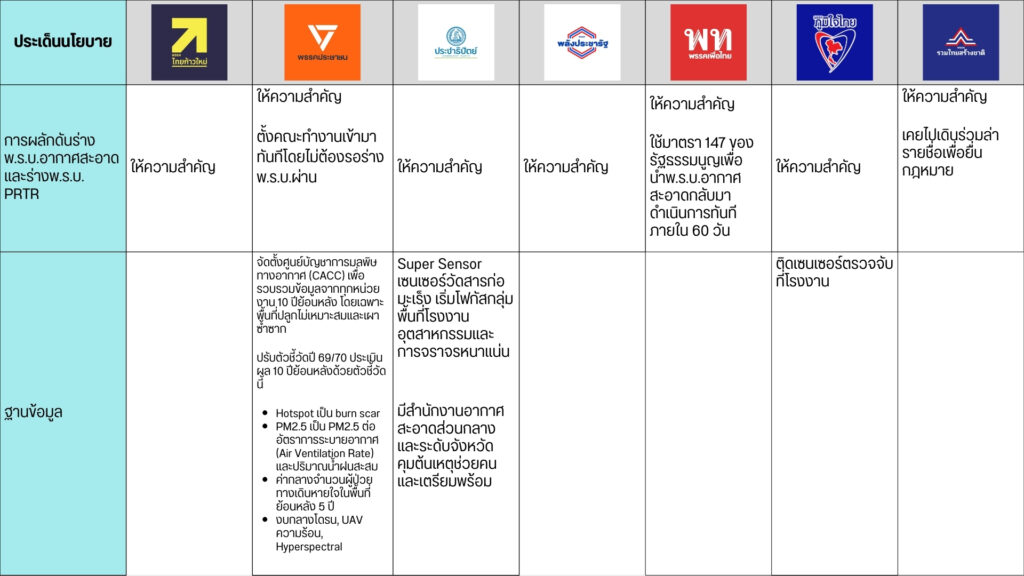 จากประเด็นการตอบคำถามในเวที ตัวแทนพรรคการเมืองต่างๆได้กล่าวถึงการผลักดันเชิงนโยบายที่เกี่ยวข้องกับสิทธิอากาศสะอาด ดังนี้