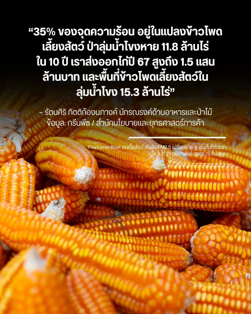 รัตนศิริ กิตติก้องนภางค์ นักรณรงค์ด้านอาหารและป่าไม้ ซึ่งเดิมเคยทำงานที่กรีนพีซได้ให้ข้อมูลการเกี่ยวโยงเรื่องอาหารกับฝุ่นมลพิษว่า มาจากการขยายตัวของข้าวโพดเลี้ยงสัตว์เพื่ออุตสาหกรรมเนื้อสัตว์ โดยข้อมูลจากสำนักนโยบายและยุทธศาสตร์การค้าระบุตัวเลขส่งออกไก่ปี 2567 สูงถึง 1.5 แสนล้านบาท และในปี 2568 ก็สูงเพิ่มขึ้นอย่างเป็นประวัติการณ์